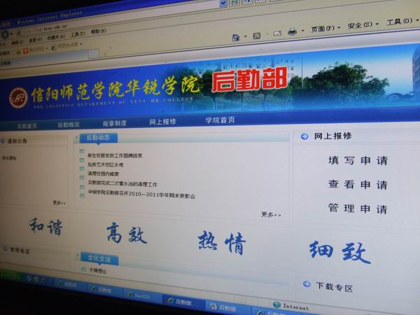 后勤部网站内容包括:后勤概况、规章制度、公告通知、常用电话、后勤动态、文化交流、网上报修、下载专区等八个栏目。其中“文化交流”主要是交流一些管理心得以及转载一些经典内容;“网上报修”主要是为了提高后勤部水电班的工作效率,同时也希望能为全院教职工带来方便免去奔波之苦;“下载专区”主要是提供维修、文印、领物等方面的资源下载。