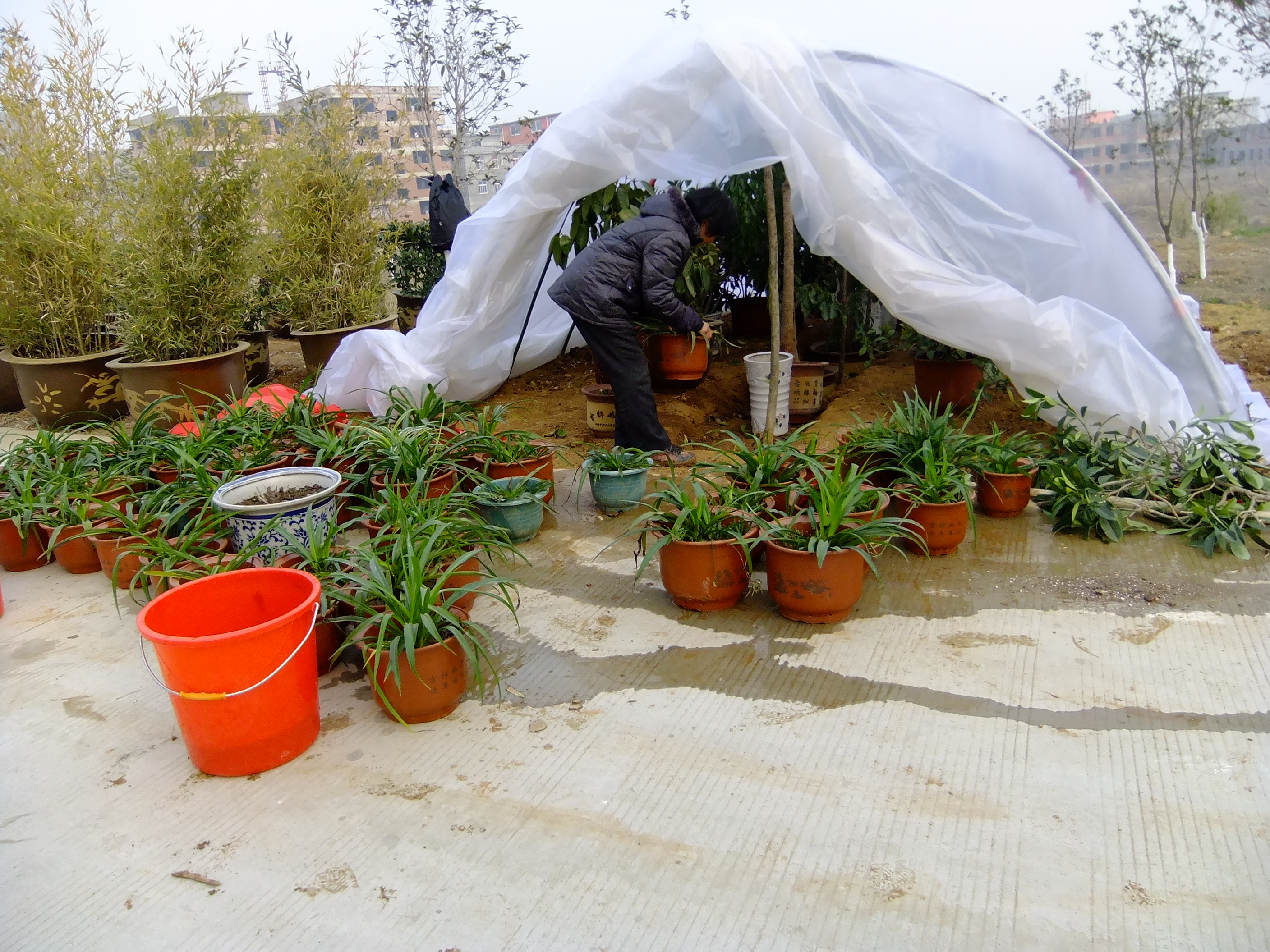 在教1楼西边、后勤部办公室东边新搭两个塑料大棚,保证了校园内花木的安全 。