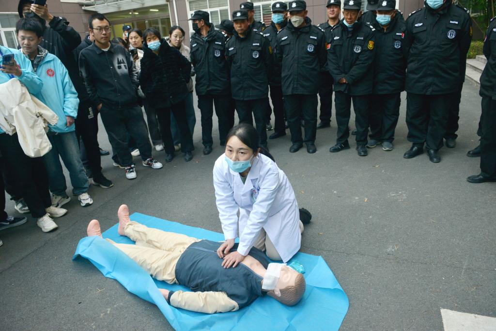 紧急救治阶段,校医院工作人员现场为同学演示并指导进行心肺复苏、烧伤等紧急处理方法。